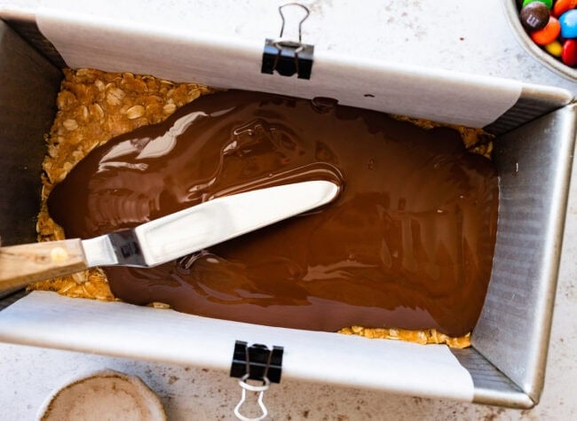- Pour the chocolate overtop of the bars. Spread with a spatula so the chocolate is in an even layer.