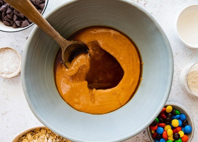 - In a medium bowl, add the peanut butter, honey, and vanilla extract. Stir together with a spatula until well combined.