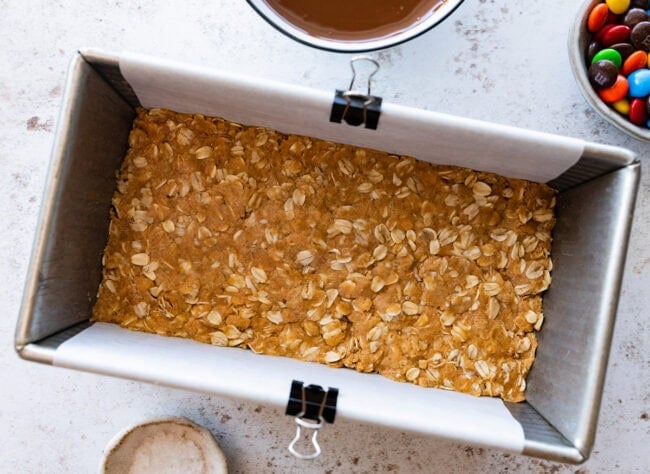 - Transfer about 2/3 of the peanut butter oat mixture to the prepared pan. Press the mixture evenly into the bottom of the pan.