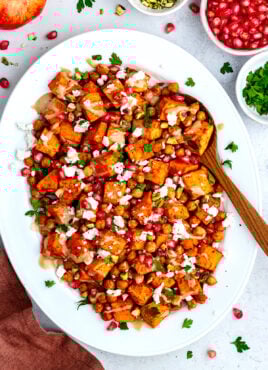 Roasted Sweet Potatoes & Chickpeas with Feta, Pomegranate & Maple Tahini