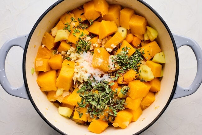 - In a large Dutch oven or pot, heat the olive oil over medium high heat. Add the butternut squash, onion, apple, carrot, and celery. Cook for 5 to 7 minutes, stirring occasionally. Add the garlic, sage, rosemary, thyme, salt, and crushed red pepper flakes. Cook for 2 minutes.