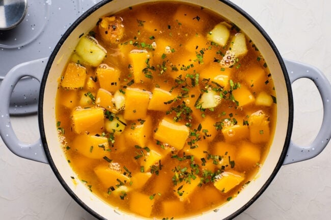 - Pour in the vegetable broth and bring to a boil. Reduce heat to low and cover the pot. Simmer for 15 to 20 minutes or until the butternut squash is fork tender.