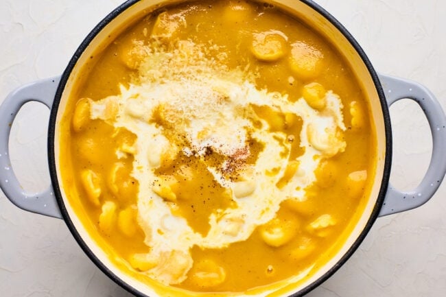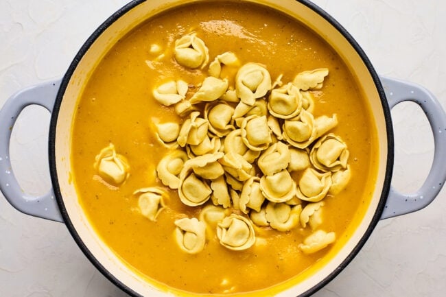 - Add the tortellini to the butternut squash soup in the pot. Cook on medium low for 5 minutes or until tortellini is cooked through.