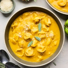 Fall is soup season in our house, and this Butternut Squash Tortellini Soup is one I look forward to all year long. It's rich, creamy, slightly sweet from the squash and apple, with a savory herb kick and cheesy tortellini in every bite, what's not to love? If you like classic butternut squash soup, I think you will love this recipe too!