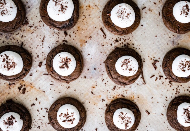 These Hot Cocoa Cookies are soft, chewy chocolate cookies topped with melty marshmallows and finished with chocolate shavings. They taste just like a cozy cup of hot cocoa and are perfect for winter baking, holiday parties, and cookie exchanges.