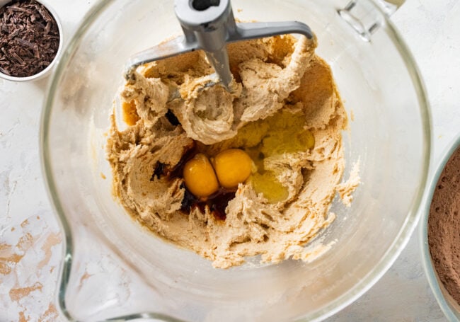 - In the bowl of a stand mixer fitted with a paddle attachment, beat the butter and sugars on medium high speed until light and creamy, about 2 minutes. Mix in the eggs and vanilla extract, scraping down the side of the bowl with a spatula, as necessary.