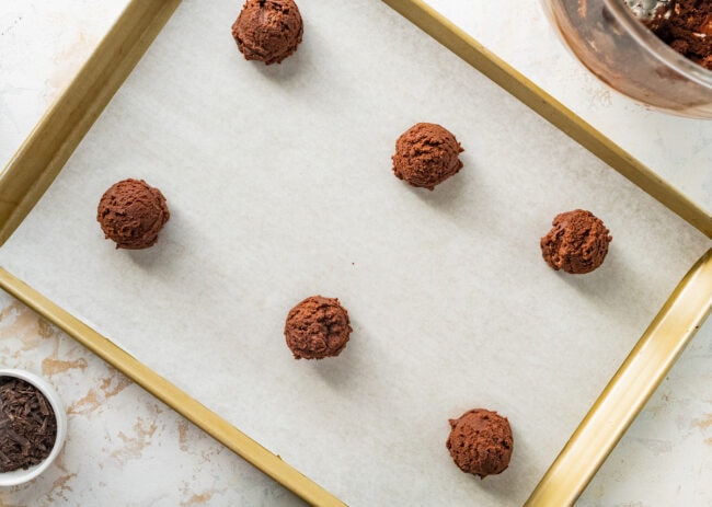- Scoop by the rounded tablespoon onto the prepared baking sheet, placing the dough balls about 2-inches apart.