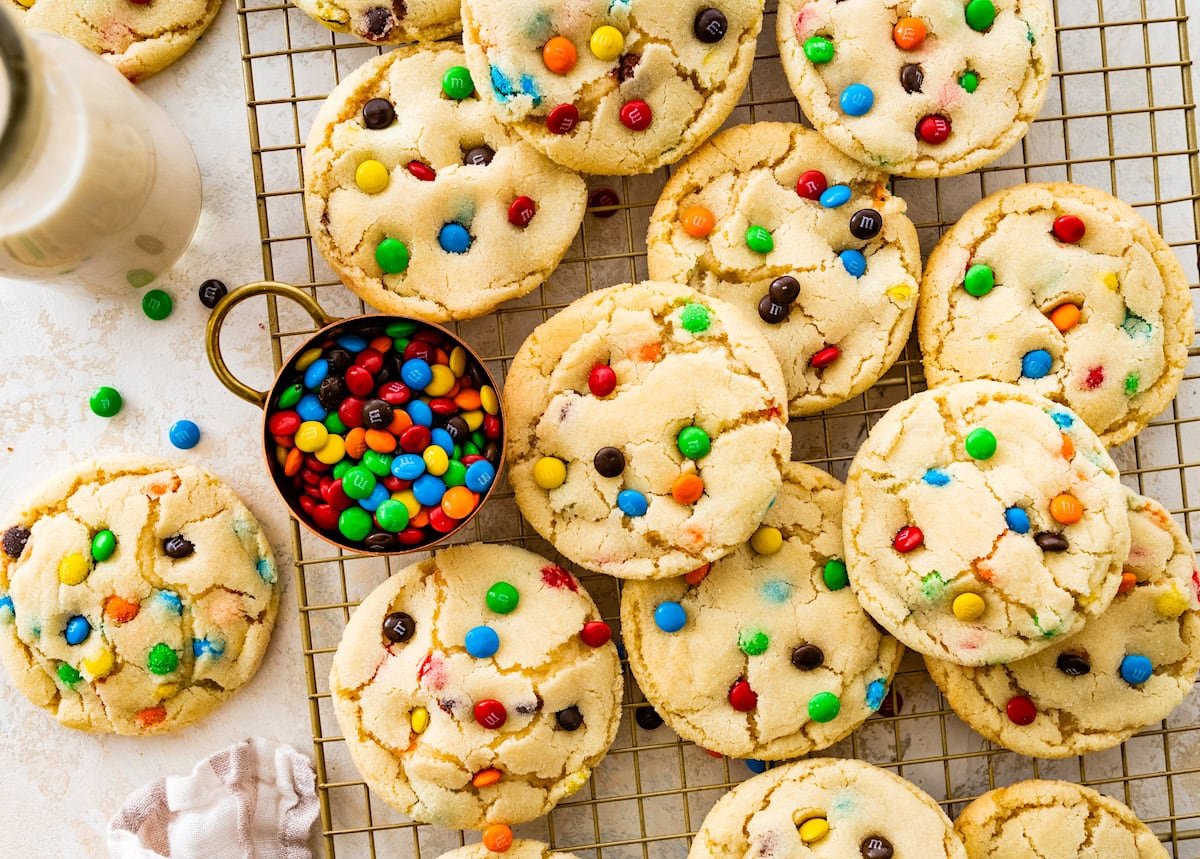- Remove the pan from the oven and gently press extra M&M's on top to make them look pretty and colorful. Let the cookies cool on the baking sheet for 5 minutes. Transfer the cookies to a cooling rack and cool completely.